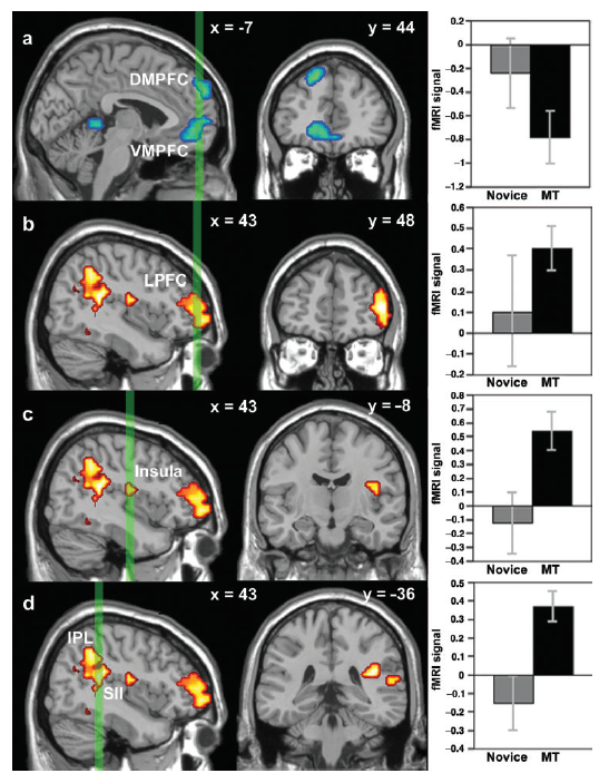 ・経験としての自己に注意を向けている時、島(Insula)、体性感覚野などの活動がマインドフルネストレーニングを受けた群で大きく上昇。