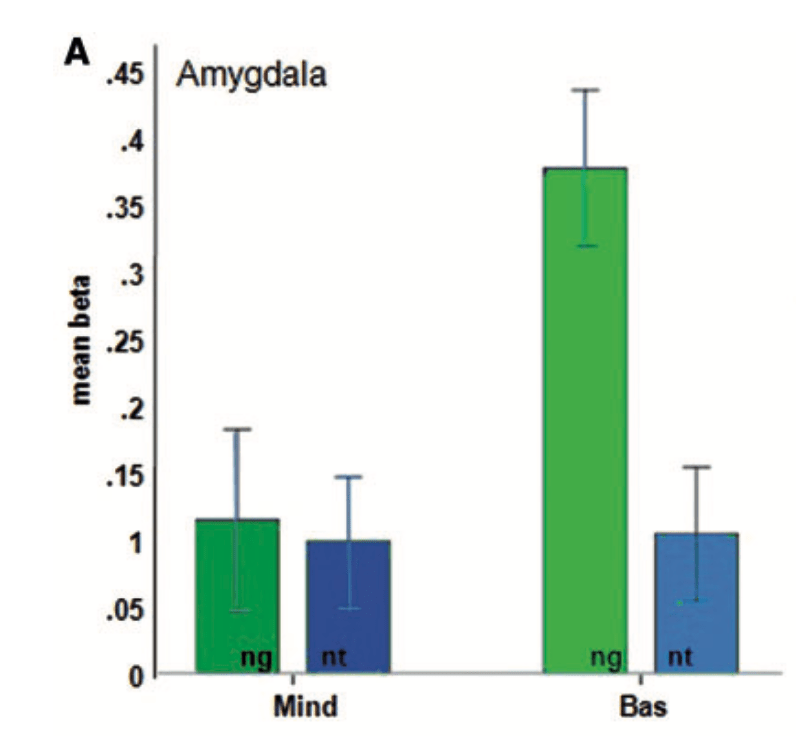 その結果、ベージックグ群と比べてマインドフルネス群でネガティブな写真を見ている時の扁桃体の活動が統計的に有意に低いことが示されました。