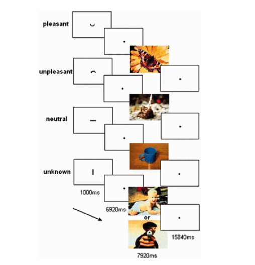 その後、MRIスキャナーの中でポジティブ、ネガティブ、ニュートラルな写真をランダムに見てもらう課題を行いました。またこの課題では、写真が出てくる前にその写真がポジティブか(∪)、ネガティブか(∩)、ニュートラルか(ー)、何が出てくるかわからないか(|)を知らせる予測のフェイズが設けられています。