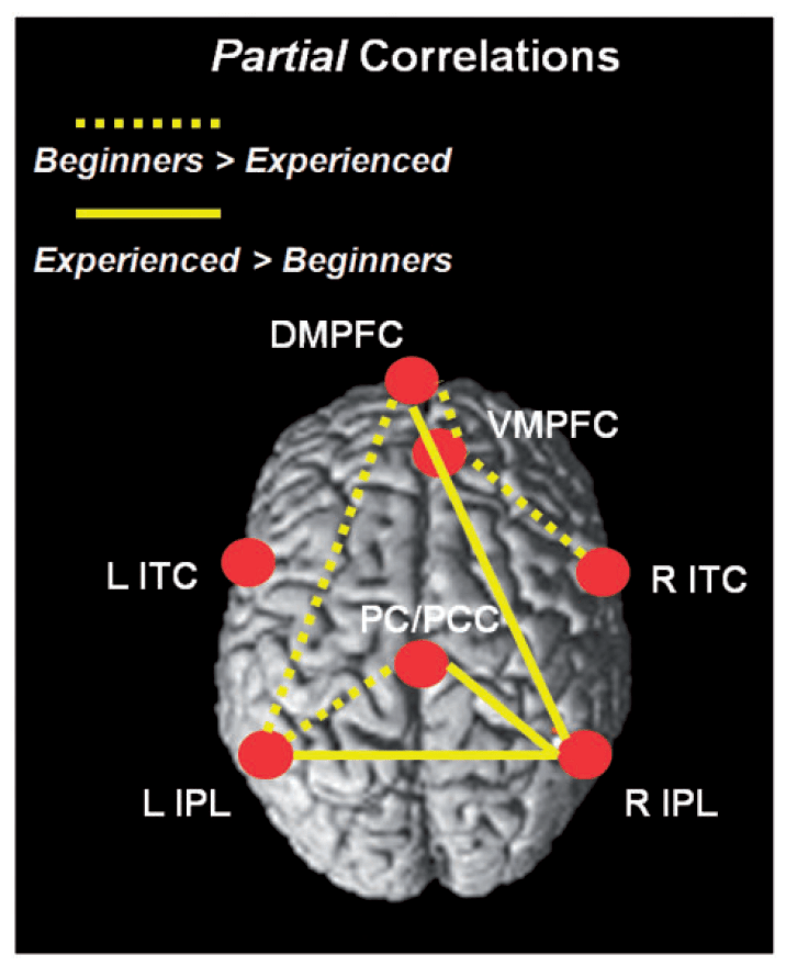 その結果、長時間瞑想者では瞑想初心者に比べて、下の図の点線で示された領域間の結合が弱く、反対に実線で示された領域間の結合は強いことが示されました。